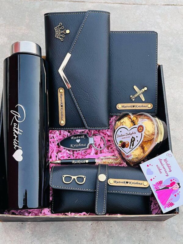 Includes 3-fold wallet, sunglass cover, passport cover, LED keychain, golden pen, 1L steel bottle, heart chocolate & wishes card.