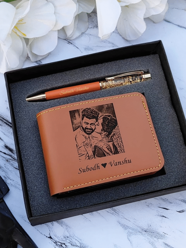 Tan faux-leather sketch wallet with personalised name engraving, paired with a Gold Flake Pen. Comes in premium box packing.