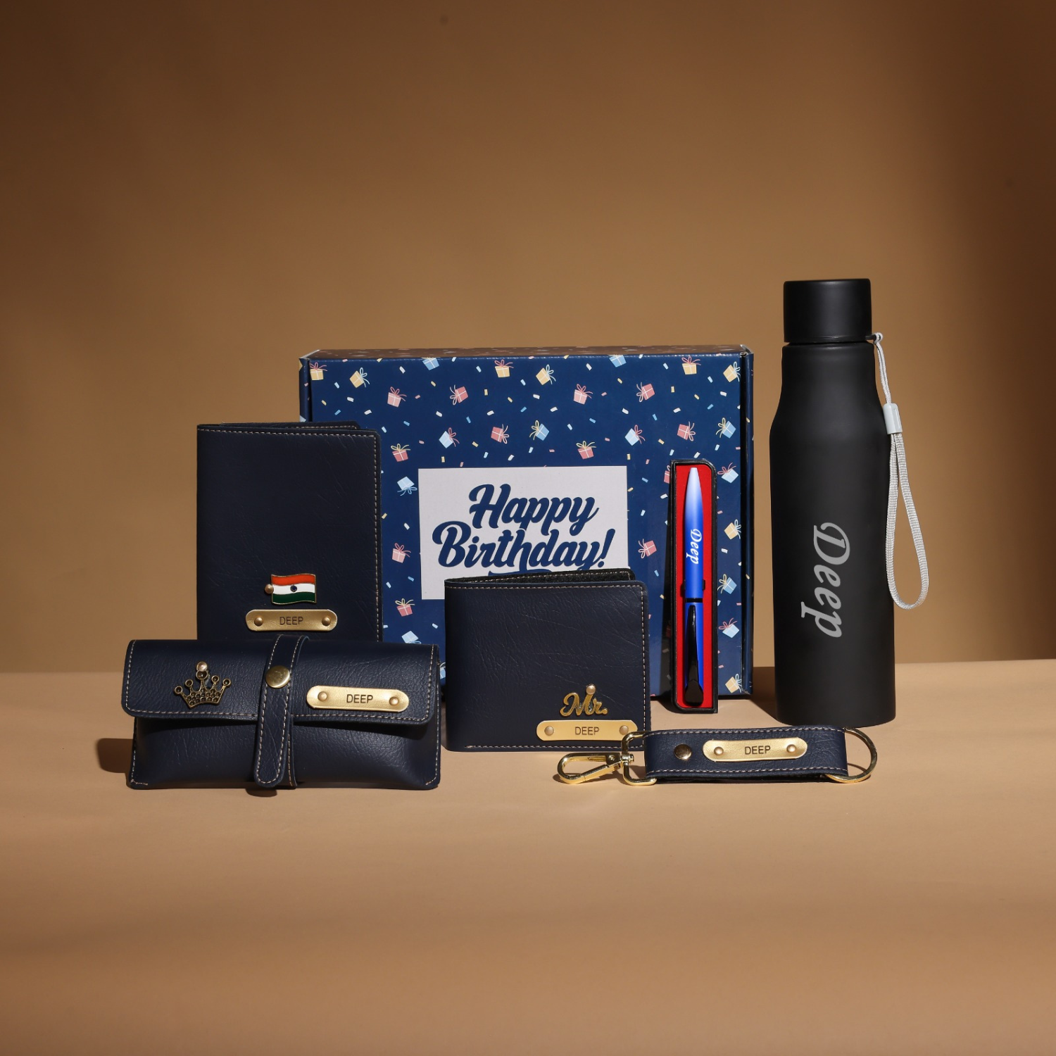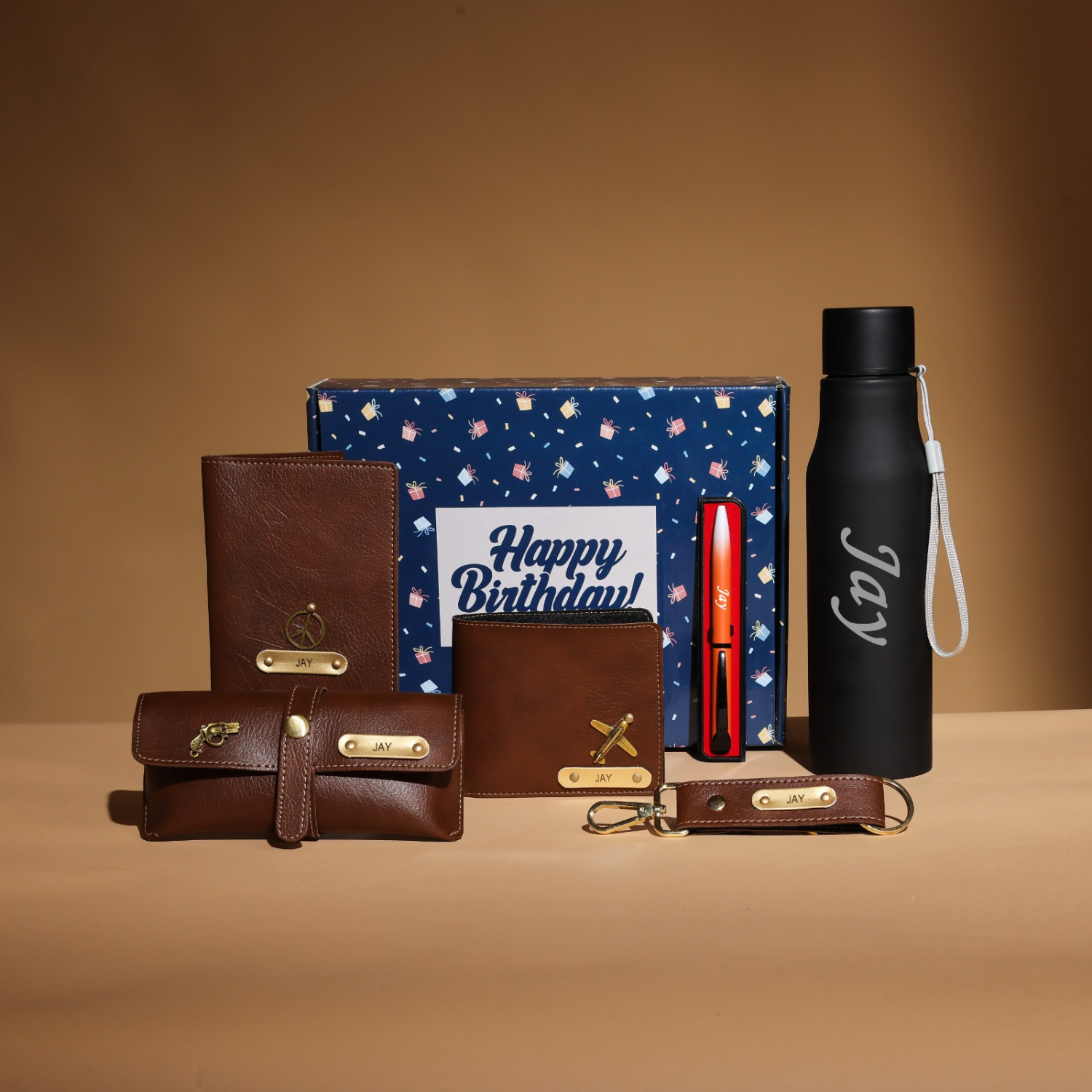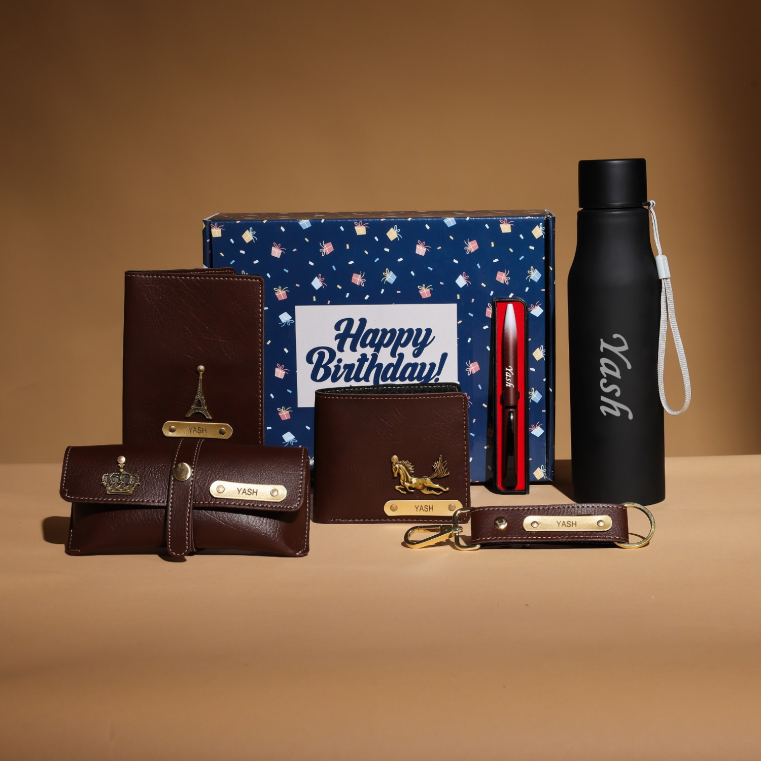 Luxury 6-in-1 personalized birthday gift combo with wallet, passport cover, keychain, eyewear case, pen & sipper. Comes in premium HD printed gift box.