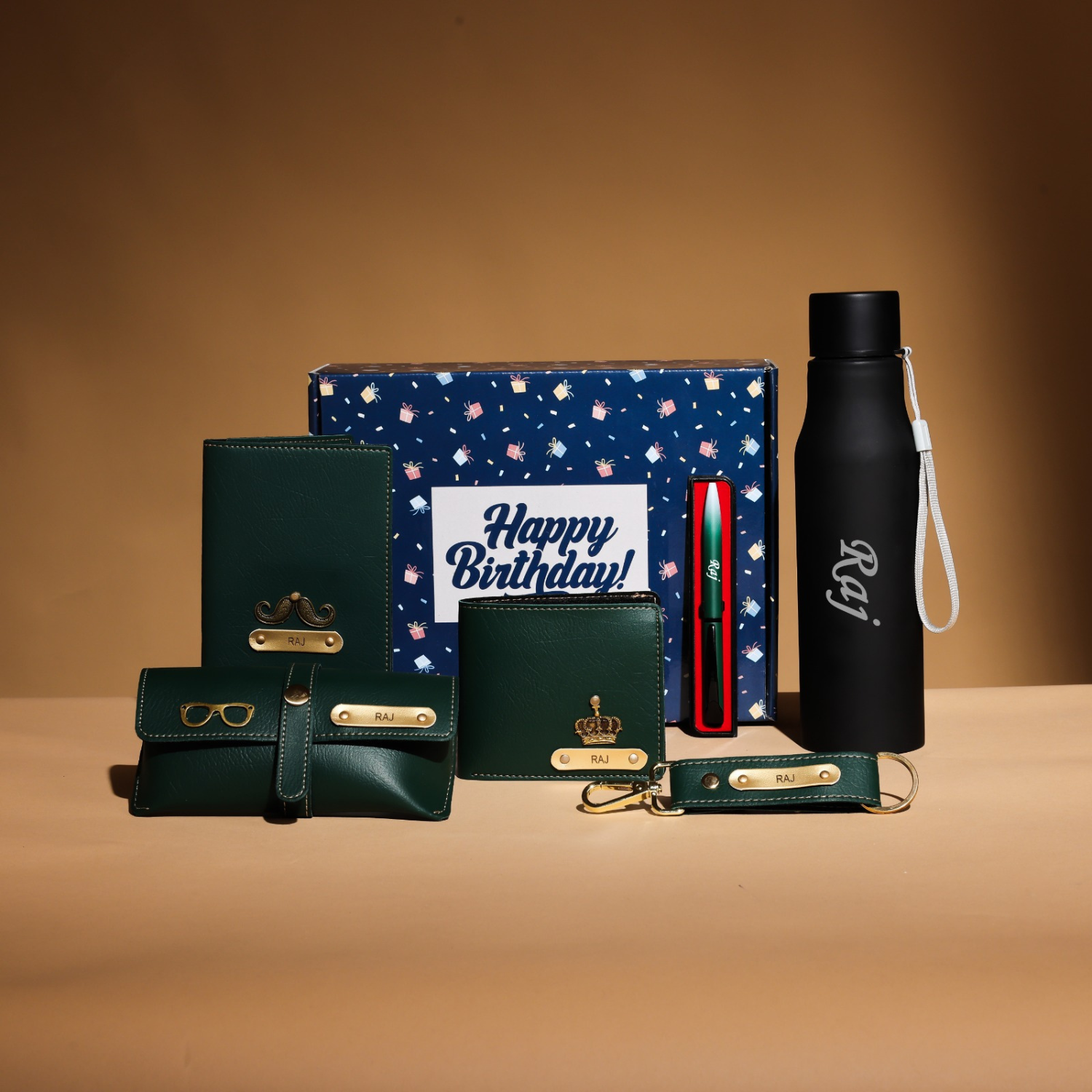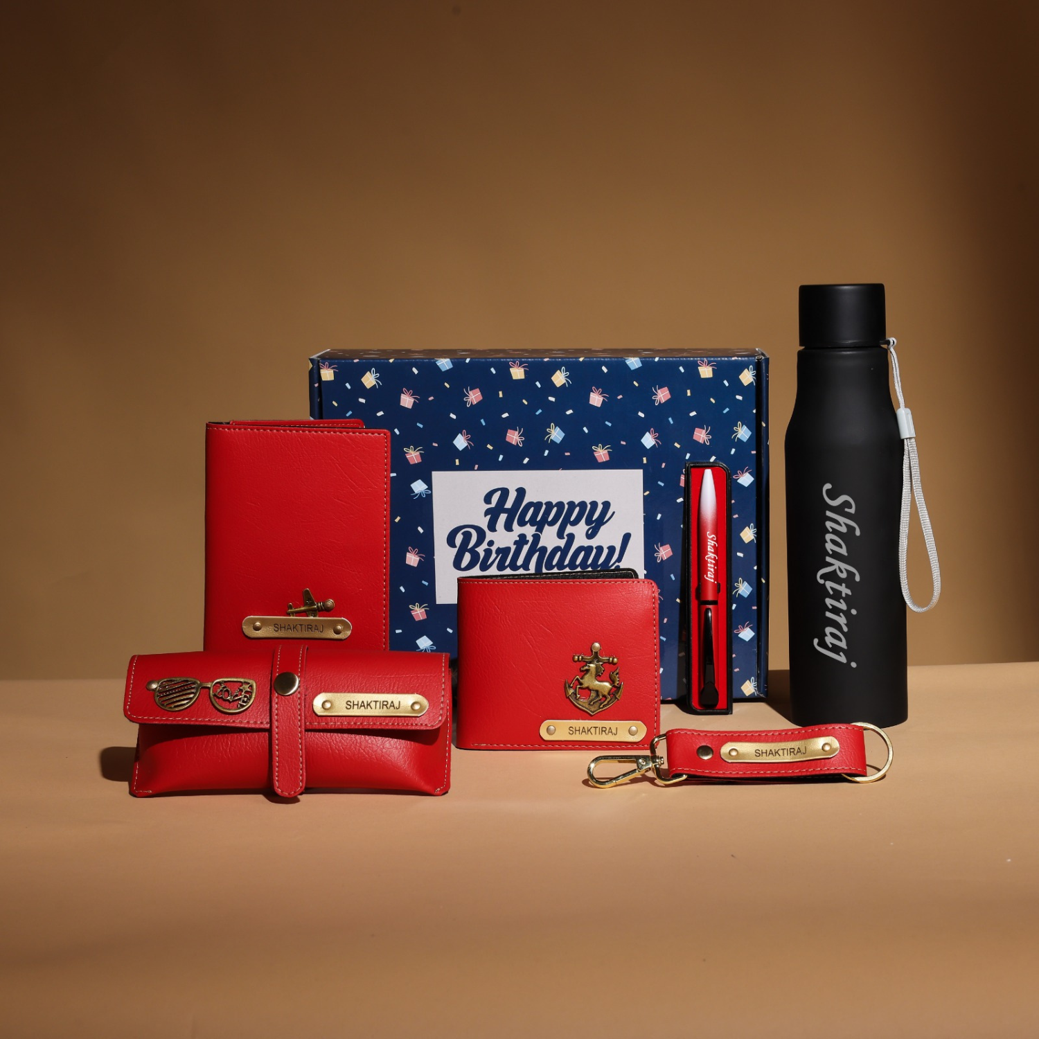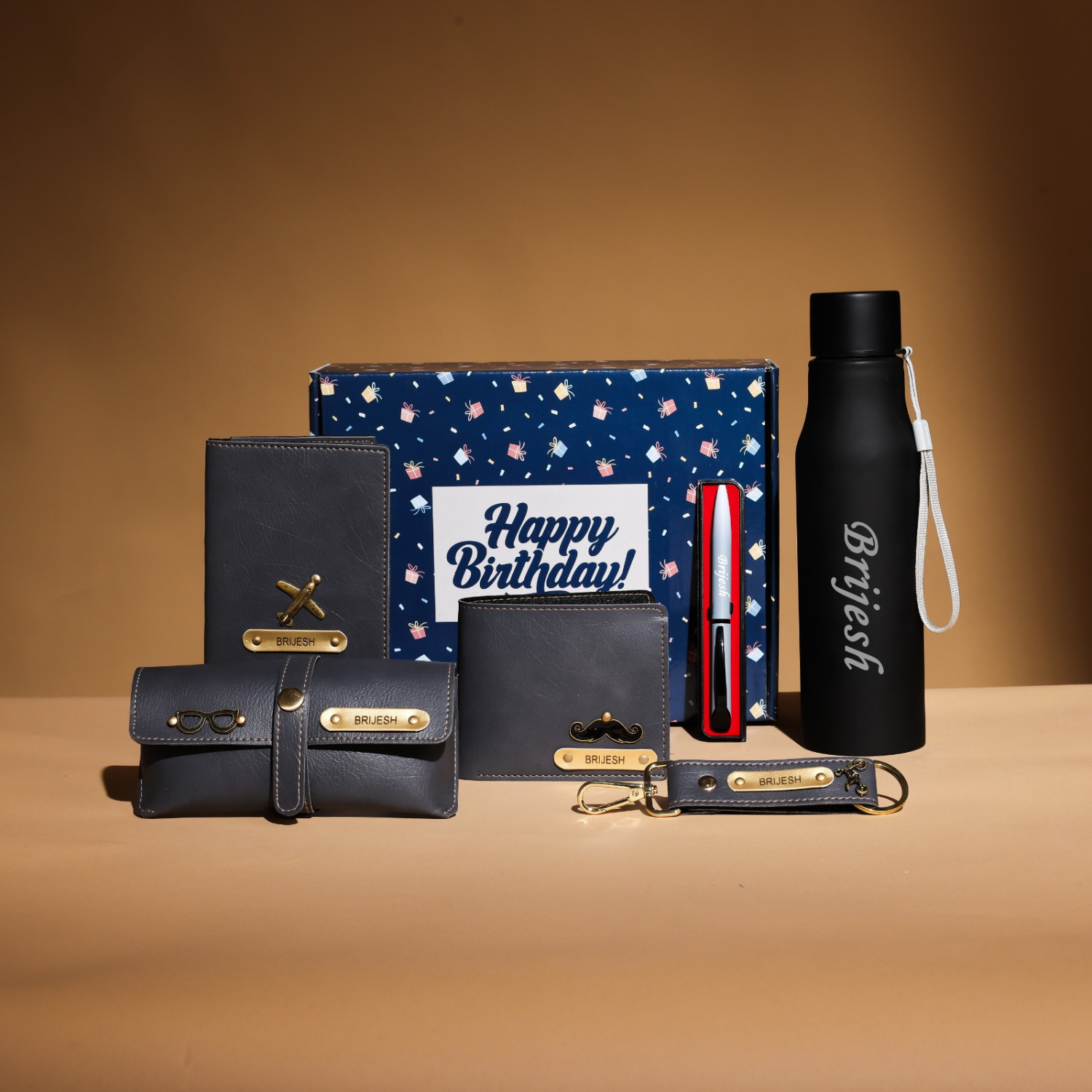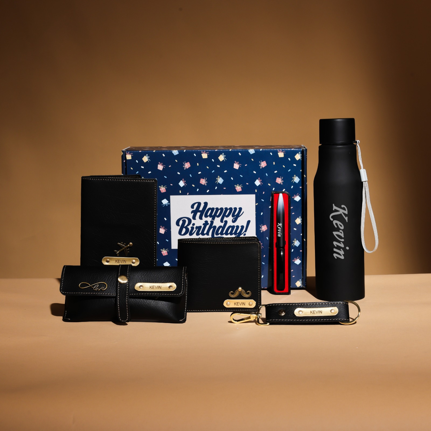 Luxury 6-in-1 personalized birthday gift combo with wallet, passport cover, keychain, eyewear case, pen & sipper. Comes in premium HD printed gift box.